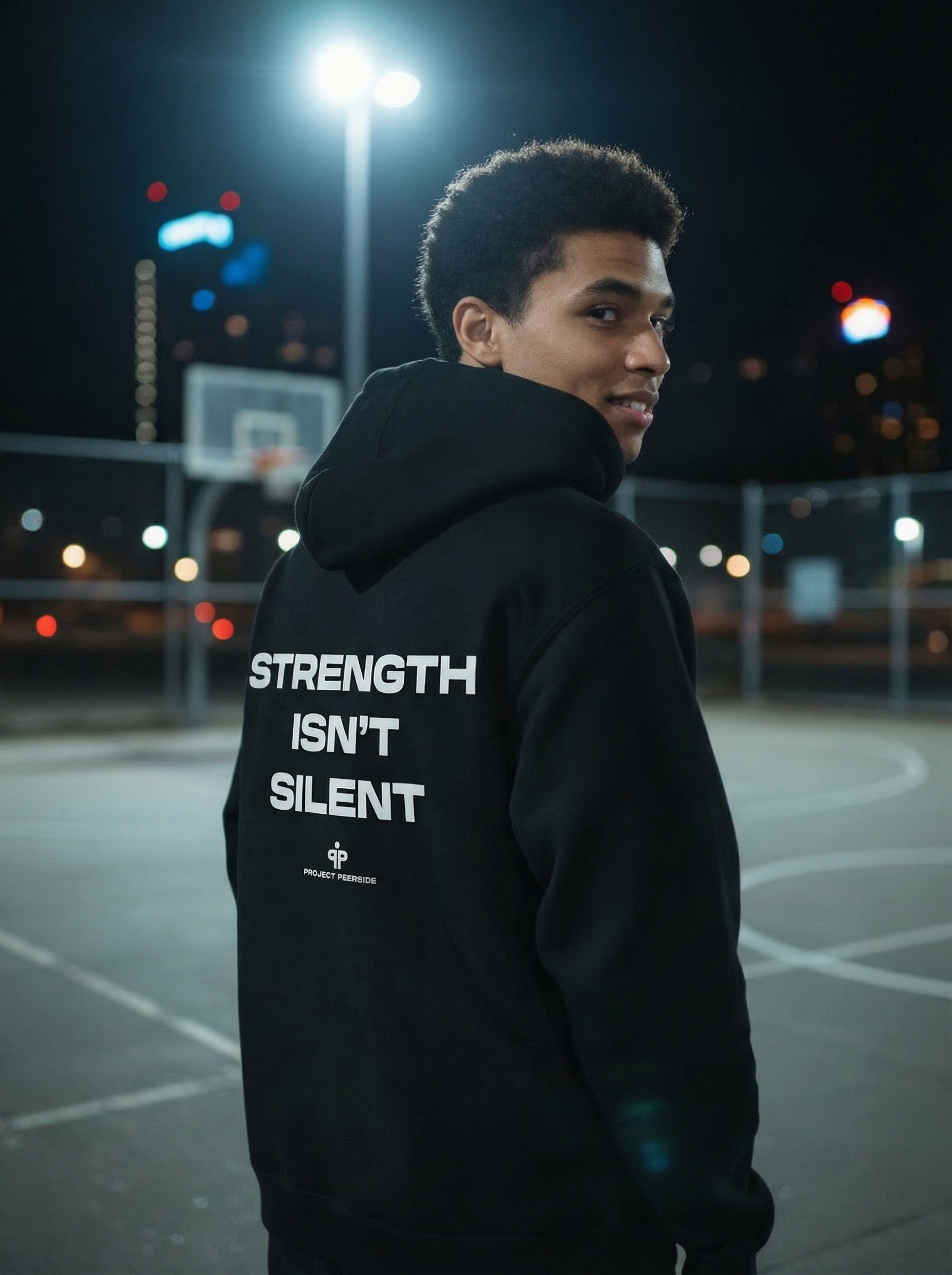 Your silence isn't strength — your voice is. This blacked-out hoodie carries "STRENGTH ISN'T SILENT" across the back in bold white, with the Peerside PP logo on the front left chest. Premium heavyweight fleece with a brushed interior. A statement piece for men who refuse to stay quiet.